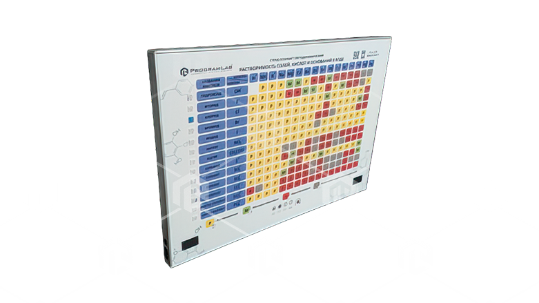 Лабораторный стенд " Растворимость кислот, оснований и солей в воде " представляет собой полноцветную светодинамическую панель, на которой представлена информация о свойствах различных химических элементов.
